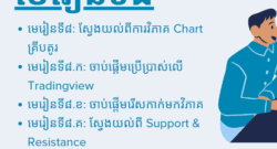 នៅក្នុងមេរៀនខាងក្រោមអ្នននឹងសិក្សាអំពី៖ មេរៀនទី៨:ការប្រើប្រាស់វិភាគ Chart របស់គ្រីបតូរ, មេរៀនទី៨.ក&ខ: ចាប់ផ្ដើមប្រើប្រាស់លើ Tradingview & ជ្រើសរើសកាក់, មេរៀនទី៨.គ: ស្វែងយល់ពី Support & Resistance, មេរៀនទី៨.ឃ: (និយមន័យ)ការប្រើ Indicator RSI + MACD.