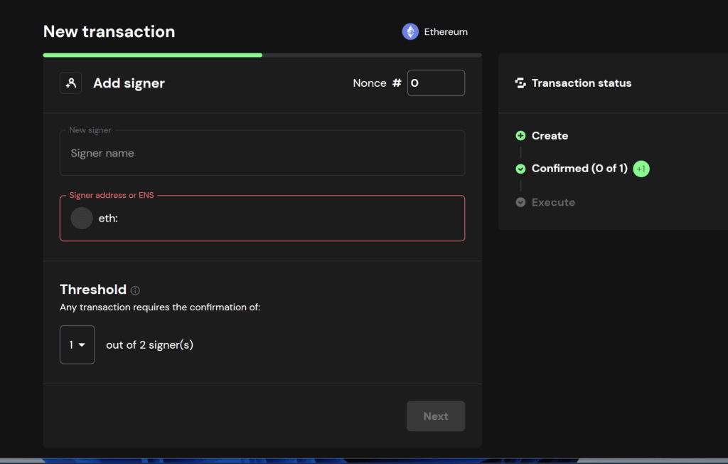 - Address ETH នៃអ្នក Signer នោះ (ត្រូវតែជា address ថ្មីនឹងមកពី seedphrase ថ្មី)