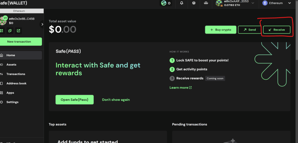 ចំពោះការទទួលគឺងាយស្រួល។អ្នកគ្រាន់តែចូលទៅកាន់ homepage Safe.Global ហើយភ្ជាប់wallet ដែលអ្នកបានបង្កើតមុននេះ បន្ទាប់មកចុចត្រង់ Receive ដូចក្នុងរូបខាងក្រោម៖