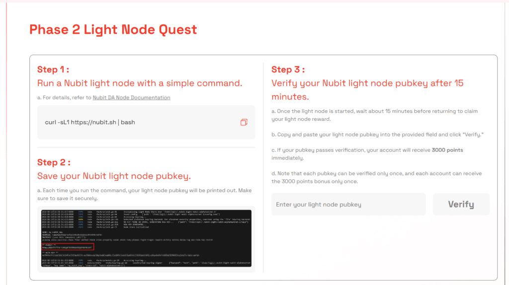 ក្រោយពីអ្នកបាន វាយ Command ខាងលើនេះ គឺអ្នកនឹងឃើញពីការ Run Node បន្ទាប់មក Scroll រក ពាក្យ pubkey ហើយ Copy មកត្រង់ប្រអប់ខាងក្រោមរួចចុច Verify. អ្នកត្រូវរង់ចាំប្រហែល 15-30min ទើបអាច Verify ជោគជ័យ។ចំពោះ ឯកសារពីជំហាននីមួយៗអ្នកអាចមើលត្រង់នេះ៖ https://docs.nubit.org/nubit-da/run-a-node
