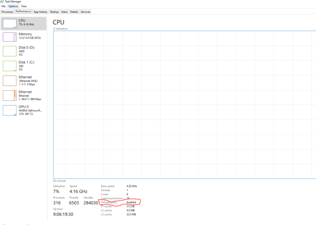 1. តើ Windows របស់អ្នកបានបើក Virtualization ហើយឬនូវ? ប្រសិនបើ Virtualization មិនទាន់បានបើក (Enable) នោះអ្នកមិនអាចធ្វើការដំណើរការ Windows Subsystem for Linux (WSL) បានទេ។ដើម្បីពិនិត្យថាបានបើកហើយឬនូវអ្នកអាចចុច Windows Key ហើយ Search “Task Manager” បន្ទាប់មកចុចលើ Performance នឹងចូលមកក្រោមស្វែងរកពាក្យ Virtualization. ប្រសិនបើបើក អ្នកនឹងឃើញ Enabled ឬបើបិទអ្នកនឹងនឹងឃើញ Disabled. មើលតាមរូបខាងក្រោម។